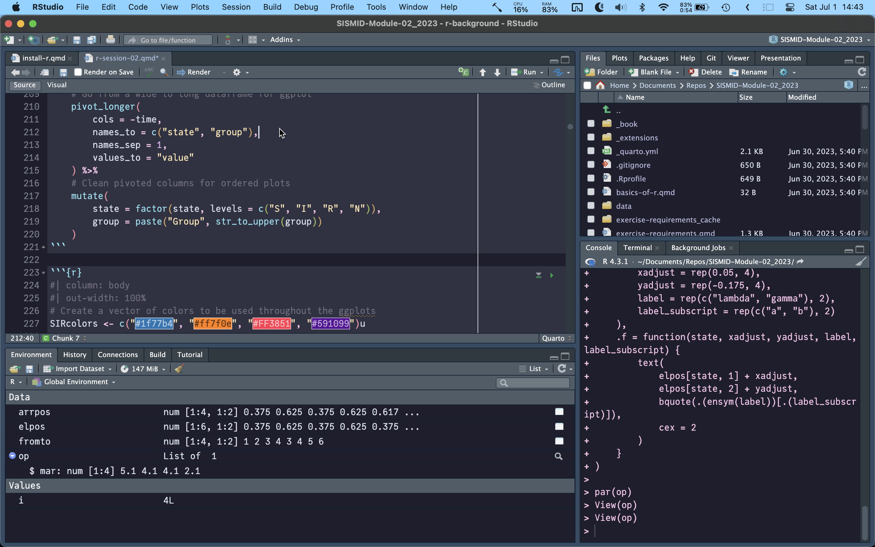 R is the programming language, but we need a way of interacting with R. We can do it directly by typing R into the terminal/command prompt, but this will give us a very pared down experience that is missing many of the essential features that make our development experience much more productive (as well as more enjoyable). For that, we want to install a Graphical User Interface (GUI), or more specifically, an Interactive Development Environment. The most suitable one for most R users is RStudio. RStudio is an easy-to-use IDE that allows us to write scripts (so we can save our analysis and rerun it easily, without needing to re-type it all), use the R console to check things quickly, provides a plotting window to easily manipulate and visualize the data, as well as an environment viewer to quickly understand what packages we have loaded and objects we have created.